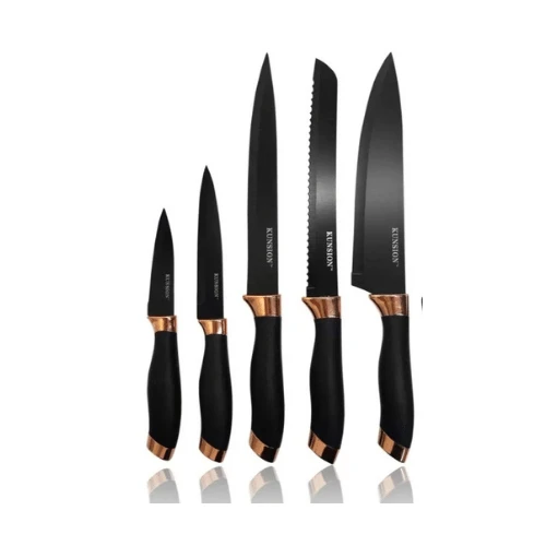 Chaque couteau possède une lame noire élégante et tranchante, idéale pour couper, trancher et émincer différents aliments avec facilité. Les poignées ergonomiques assurent une prise en main confortable et sécurisée pour une utilisation quotidienne.